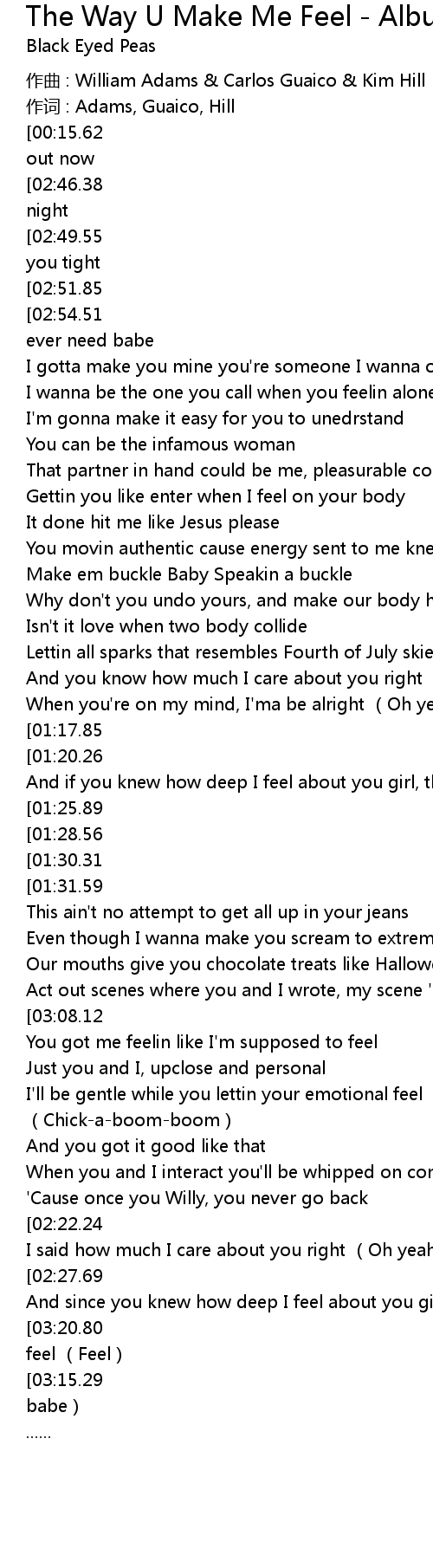 | [03:25.46][03:15.29] | You got me feelin like I' m supposed to feel Tell me babe |