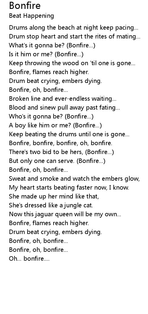 Bonfire, bonfire, bonfire, oh, bonfire. |