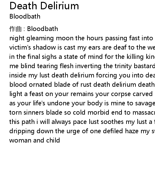 | night gleaming moon the hours passing fast into the bloodstained walls the victim' s shadow is cast my ears are deaf to the weakened cries born my rapture in the final sighs a state of mind for the killing kind a fog of death leaving me blind tearing flesh inverting the trinity bastard child of god delusion inside my lust death delirium forcing you into death' s affinity drowning in your blood ornated blade of rust death delirium death my disease saved me from the light a feast on your remains your corpse carved up with delight i am laughing as your life' s undone your body is mine to savage now as you' re gone the skin is torn sinners blade so cold morbid end to massacres of old gone soul is drained this path i will always pace lust soothes my lust a freak of the human race red dripping down the urge of one defiled haze my sweetest wish is slaying your woman and child |
