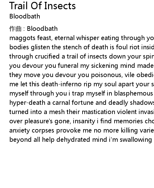 | maggots feast, eternal whisper eating through your soul in your head their bodies glisten the stench of death is foul riot inside you swarming around and through crucified a trail of insects down your spine vermin inside you control you devour you funeral my sickening mind made you dissolve vermin inside you they move you devour you poisonous, vile obedience to rotting deadened art made me let this death-inferno rip my soul apart your skin is turning blue i kill myself through you i trap myself in blasphemous torture mind decaying fast in hyper-death a carnal fortune and deadly shadows cast all the rotting flesh turned into a mesh their mastication violent invasion of my mind emptiness takes over pleasure's gone, insanity i find memories choke me chloroform drenched anxiety corpses provoke me no more killing variety pestering forgery i'm gone beyond all help dehydrated mind i'm swallowing insects myself |