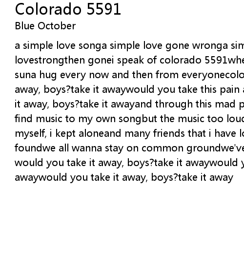 a simple love songa simple love gone wronga simple way to copewith six years of lovestrongthen gonei speak of colorado 5591where there's a paxil-plated morning suna hug every now and then from everyonecolorado 5591but would you take it away, boys?take it awaywould you take this pain away?take it awaywould you take it away, boys?take it awayand through this mad parade i walked aloneand tried to find music to my own songbut the music too loud or the crowd too strongi kept to myself, i kept aloneand many friends that i have lostand many friends that i've foundwe all wanna stay on common groundwe've got to find this common groundbut would you take it away, boys?take it awaywould you take my pain away?take it awaywould you take it away, boys?take it away |