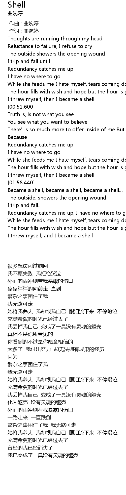 | [02:03.900] | Became a shell, became a shell, became a shell |
