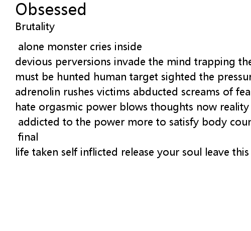 [music by Acres/Walsh, lyrics by Reigel/Acres] alone monster cries inside devious perversions invade the mind trapping the anger emotional tension prey must be hunted human target sighted the pressures building [solo:Walsh] adrenolin rushes victims abducted screams of fear feeling higher seduced with hate orgasmic power blows thoughts now reality contorted body in pain [solo:Walsh] addicted to the power more to satisfy body count rises human errors follow the trail soon it will end no escape deny the capture [solo: Walsh] final life taken self inflicted release your soul leave this hell |