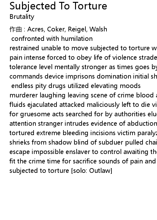 | music by Walsh Acres, lyrics by Coker Reigel confronted with humilation restrained unable to move subjected to torture wretched sick preverted hunger pain intense forced to obey life of violence stradegy to prey on weakness tolerance level mentally stronger as times goes by survive by will voice commands device imprisons domination initial shock change perception defile the innocent. ridicule solo: Outlaw endless pity drugs utilized elevating moods murderer laughing leaving scene of crime blood and sweat flow from body foreign fluids ejaculated attacked maliciously left to die vicious criminal no remorse for gruesome acts searched for by authorities eluding manhunt diverting attention stranger intrudes evidence of abductions fate is met unexpected tortured extreme bleeding incisions victim paralyzed motionless in the dark shrieks from shadow blind of subduer pulled chains twisting solo: Outlaw escape impossible enslaver to control awaiting the sentence let the punishment fit the crime time for sacrifice sounds of pain and pleasure total silence subjected to torture solo: Outlaw |