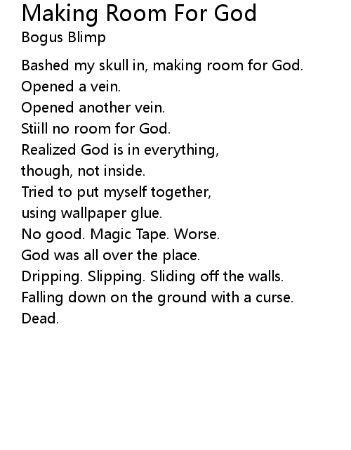 | Bashed my skull in, making room for God. | |