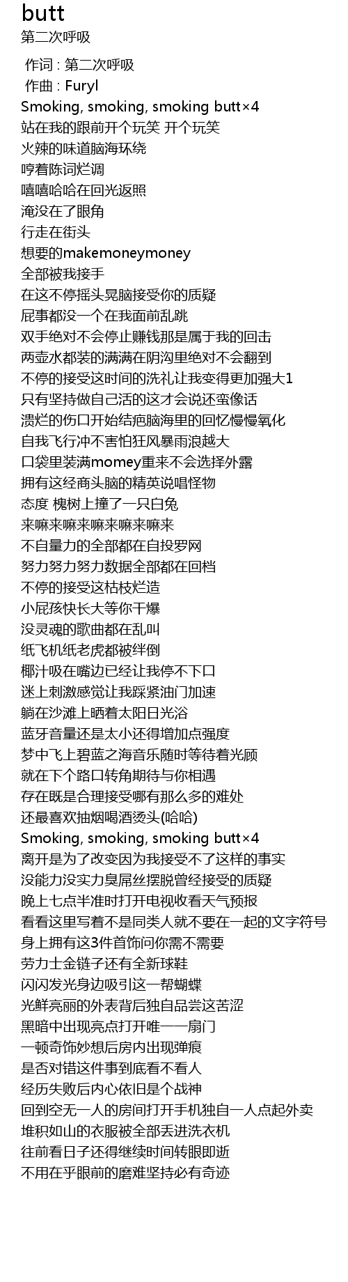| [02:12.314] | Smoking, smoking, smoking butt 4 |