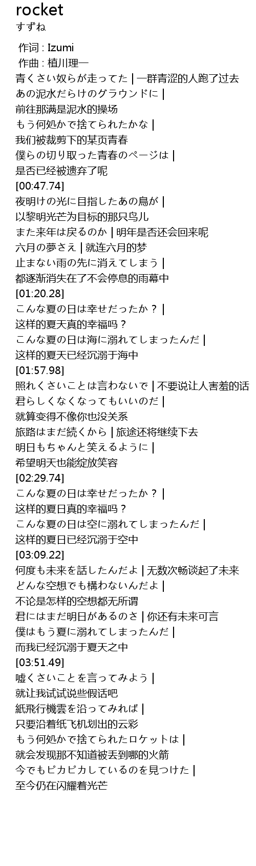 | [04:12.33] | もう何処かで捨てられたロケットは | 就会发现那不知道被丢到哪的火箭 |