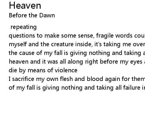 | [music: Tuomas Saukkonen, words:Tuomas Saukkonen/Panu Willman] repeating questions to make some sense, fragile words could offer great defence against myself and the creature inside, it's taking me over again this evil inside me, the cause of my fall is giving nothing and taking all failure in re-creation of heaven and it was all along right before my eyes already in hell, no reason to die by means of violence | |