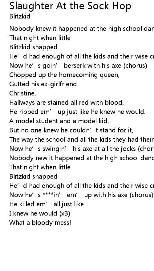 | Now he’s swingin’ his axe at all the jocks (chorus) | |