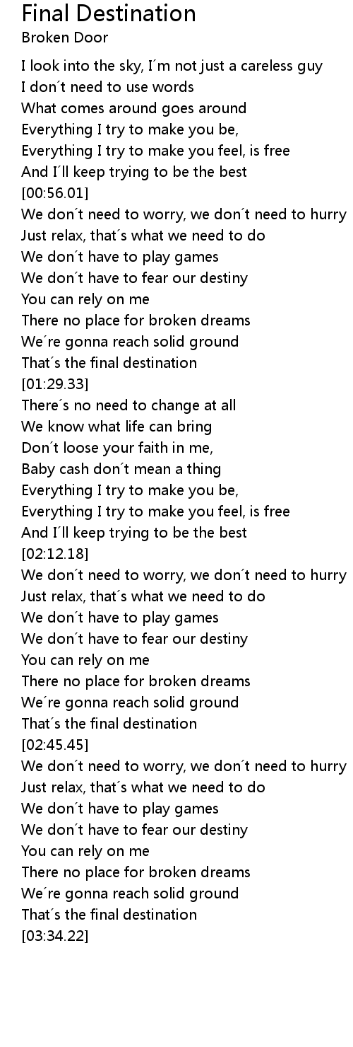 | [00:57.46] | We don´t need to worry, we don´t need to hurry |
