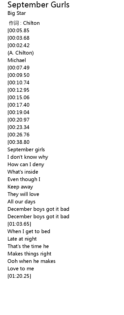 | [01:24.76][00:03.68] | The Bangles - September Gurls |