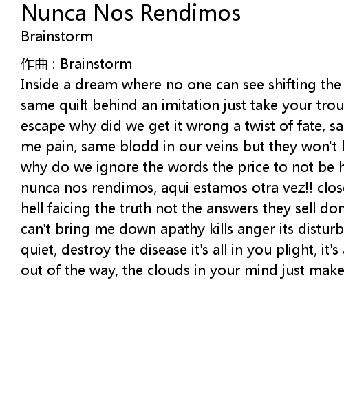 | Inside a dream where no one can see shifting the shadwos from my own memories same quilt behind an imitation just take your troubles as they come but can' t escape why did we get it wrong a twist of fate, same black situation it causes me pain, same blodd in our veins but they won' t hide as parts of me have died why do we ignore the words the price to not be heard a circle, more or less nunca nos rendimos, aqui estamos otra vez!! close to the flames, just seems like hell faicing the truth not the answers they sell don' t let us fall back, you can' t bring me down apathy kills anger its disturbing the peace try not to be quiet, destroy the disease it' s all in you plight, it' s all you should know get out of the way, the clouds in your mind just make a change and banish the blind |