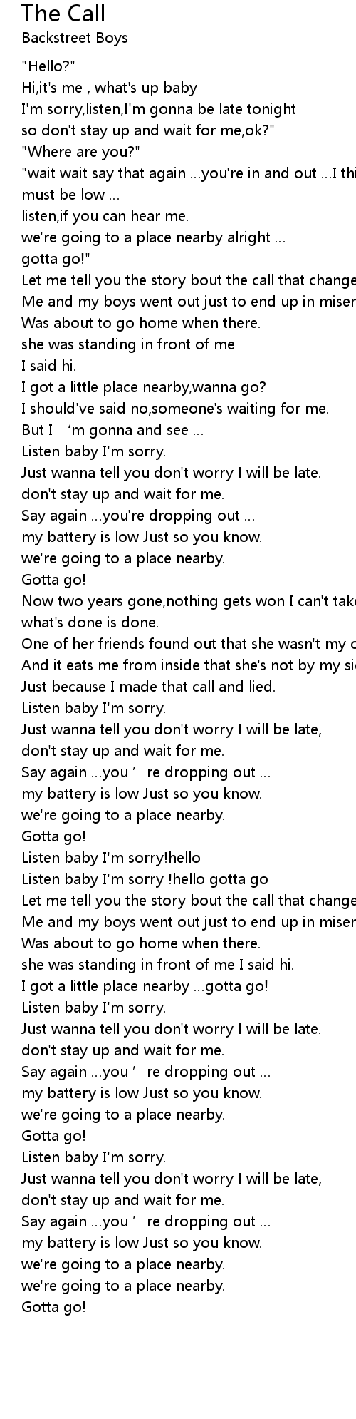 | [01:56.58] | Listen baby I' m sorry ! hello gotta go |