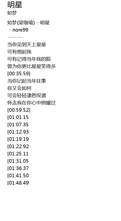 | [00:03.00] | 如梦(梁珈瑜) - 明星 |