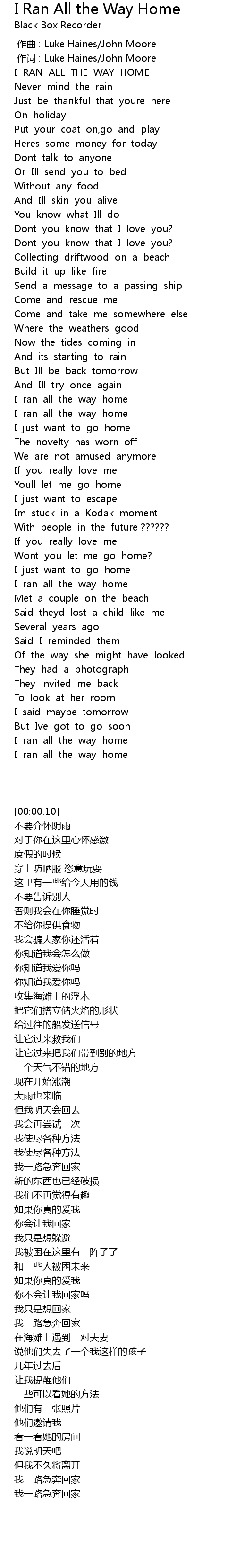 | [00:00.10] | I RAN ALL THE WAY HOME |
