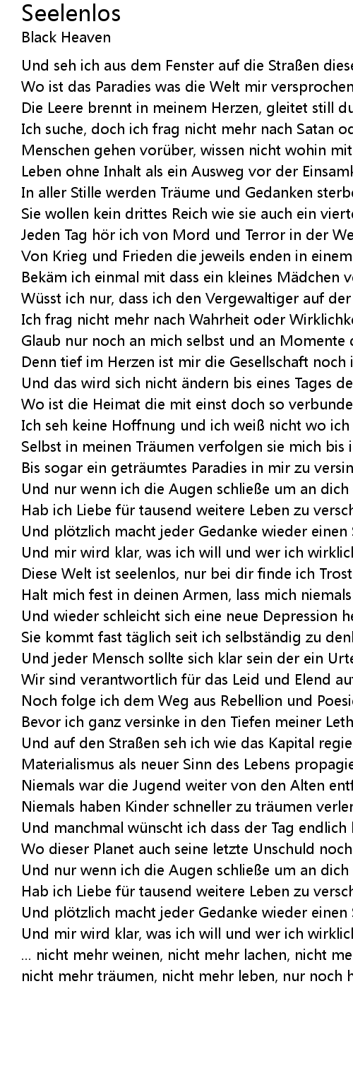 | Die Leere brennt in meinem Herzen, gleitet still durch meinen Kopf | |