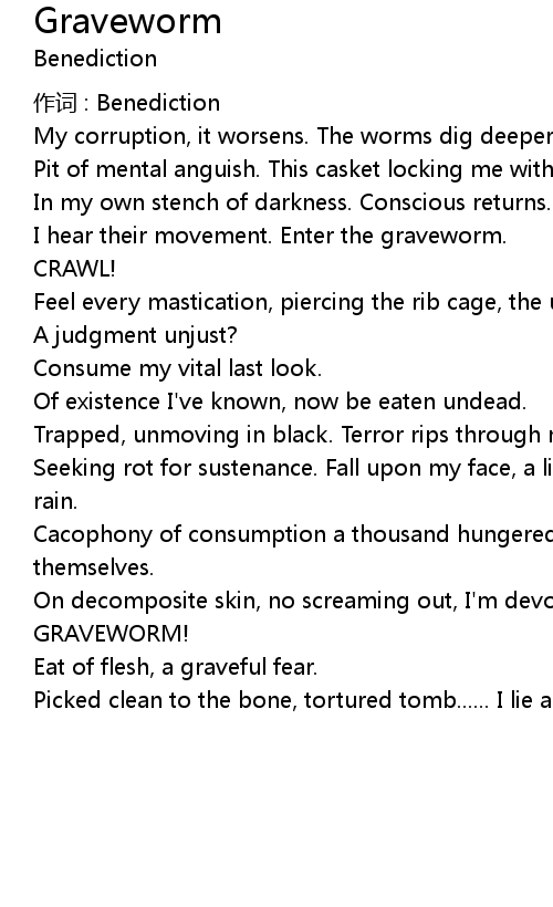| Seeking rot for sustenance. Fall upon my face, a living squirming = | |