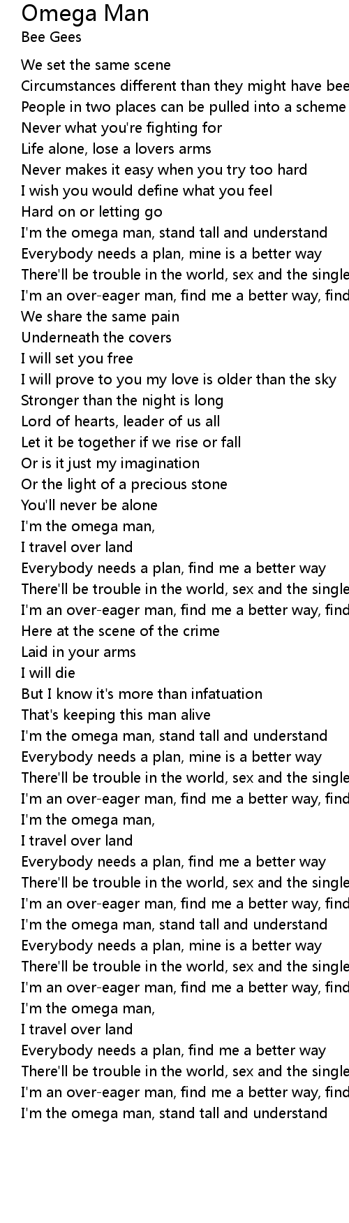 | I'm the omega man, stand tall and understand | |