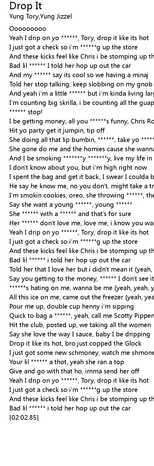 | [00:10.34] | Yeah I drip on yo ******, Tory, drop it like its hot |
