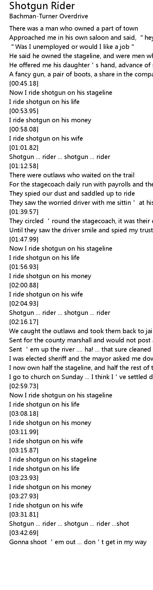 | [03:34.75] | Shotgun ... rider ... shotgun ... rider ...shot |
