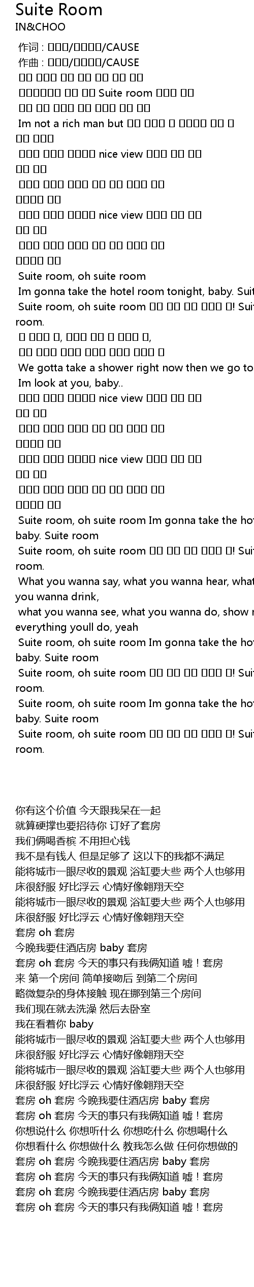 | [02:09.094] | Suite room, oh suite room 오늘 일은 우리 둘이만 쉿! Suite room. |