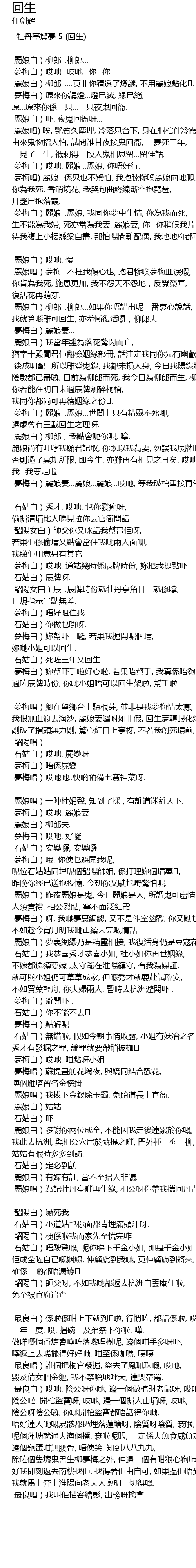 | 最良白)哎吔, 陰公呀你哋, 邊一個做棺財老鼠呀, 哎吔, 陰公啦, 開棺盜寶呀, 哎吔, 邊一個掘人山墳呀, 哎吔, 陰公呀陰公囉, 你哋開棺盜寶都唔話得你哋, 唔好連人哋嘅屍骸都扔埋落蓮塘呀, 陰質呀陰質, 袞啦, 呢個蓮塘就通大海個播, 袞啦呢賬, 一定係大魚食咸魚定囉, 邊個龜蛋咁無腰骨, 唔使笑, 知到八八九九, 除咗個隻壞鬼書生柳夢梅之外, 仲邊一個有咁狠心狗肺呢, 好我即刻返去南樓找佢, 找得著佢由自可, 如果揾佢唔到哩, 我就馬上奔上淮陽向老大人稟明一切得嘅. | |