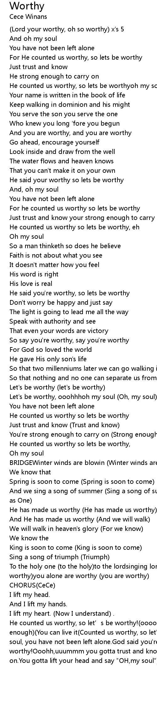 | He counted us worthy, so let’s be worthy!(ooooooohhhhhh, I said you're strong enough)(You can live it(Counted us worthy, so let's be worthy, ooohh)(And oh my soul, you have not been left alone.God said you're worthy, God said you're worthy!Ooohh,uuummm you gotta trust and knowYou’re strong enough to carry on.You gotta lift your head and say "OH,my soul") |