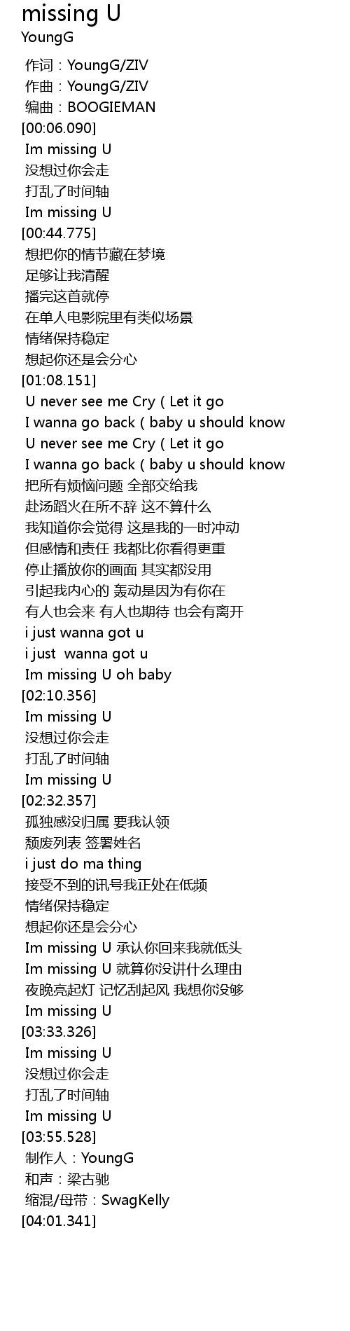 | [03:06.328] | Im missing U jiù suàn nǐ méi jiǎng shén me lǐ yóu |