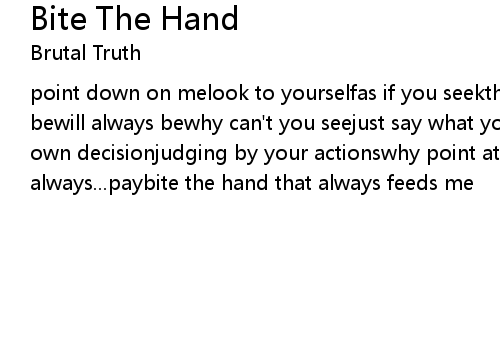 | point down on melook to yourselfas if you seekthink for yourselffor what's to bewill always bewhy can't you seejust say what you got to saylife creates its own decisionjudging by your actionswhy point at me?conditioned fool will always...paybite the hand that always feeds me |