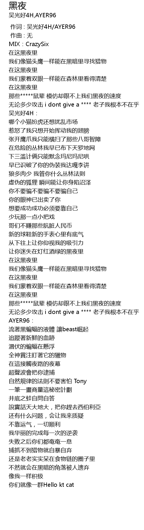 | [01:46.811] | 那些*****鼠辈 模仿却跟不上我们黑夜的速度 |