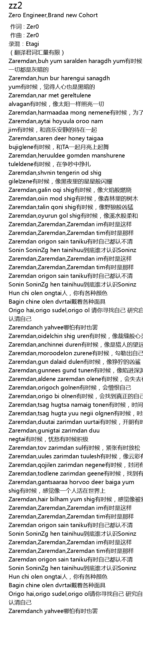 | [02:56.922] | Zaremdan origon sain taniku有时自己都认不清 |