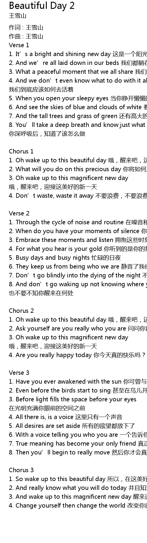 | 1. So wake up to this beautiful day suǒ yǐ, zài zhè měi hǎo de yì tiān xǐng lái ba | |