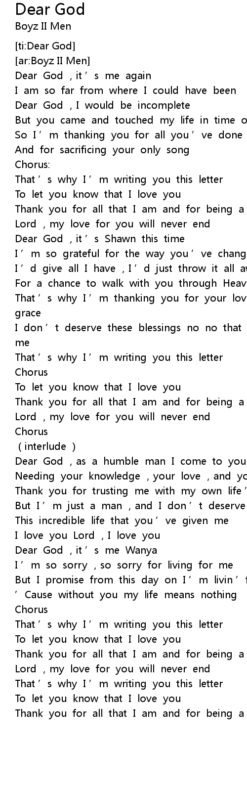 | [00:14.39] | Dear God , it ' s me again |