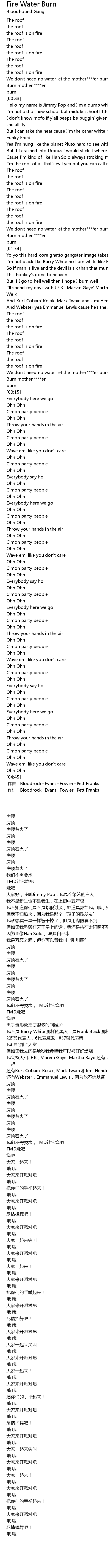 | [01:45] | We don't need no water let the mother****er burn |
