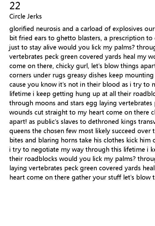 glorified neurosis and a carload of explosives our doctor friend's just a wee bit fried ears to ghetto blasters, a prescription to disaster an all day job just to stay alive would you lick my palms? through moons and stars egg laying vertebrates peck green covered yards heal my wounds cut straight to my heart come on there, chicky gurl, let's blow things apart! honesty and epic shock into corners under rugs greasy dishes keep mounting up ??? can't be straight forward cause you know it's not in their blood as i try to negotiate my way through this lifetime i keep getting hung up at all their roadblocks would you lick my palms? through moons and stars egg laying vertebrates peck green covered yards heal my wounds cut straight to my heart come on there chicky gurl let's blow things apart! as public's slaves to dethroned kings transvestite brothers strung out queens the chosen few most likely succeed over there a sucker's born mosquito bites and blaring horns take his clothes kick him out then give him the keys as i try to negotiate my way through this lifetime i keep getting hung up at all their roadblocks would you lick my palms? through moons and stars while egg laying vertebrates peck green covered yards heal my wounds cut straight to my heart come on there gather your stuff let's blow things apart!!