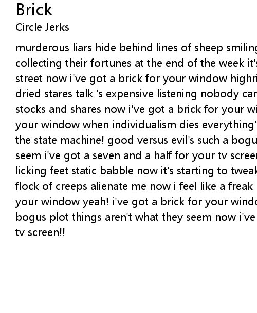 murderous liars hide behind lines of sheep smiling killers find it easy to sleep collecting their fortunes at the end of the week it's sixty five on a one way street now i've got a brick for your window highrise hogwash dealt to freeze dried stares talk 's expensive listening nobody cares cram those bank account's stocks and shares now i've got a brick for your window now i've got a brick for your window when individualism dies everything's the same you can kiss my ass to the state machine! good versus evil's such a bogus plot things aren't what they seem i've got a seven and a half for your tv screen! herds of paper eaters licking feet static babble now it's starting to tweak company kept is just a flock of creeps alienate me now i feel like a freak now i've got a brick for your window yeah! i've got a brick for your window good versus evil's such a bogus plot things aren't what they seem now i've got a seven and a half for your tv screen!!