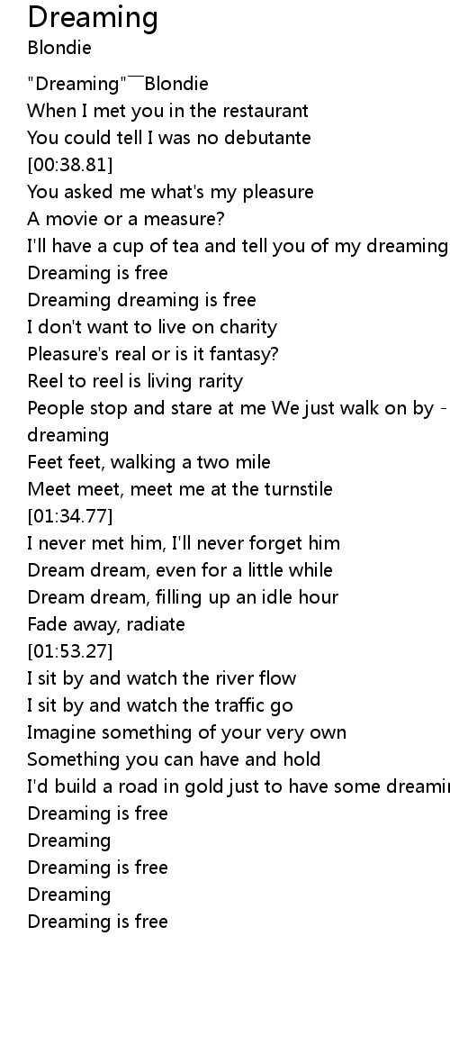 | [01:19.23] | People stop and stare at me We just walk on by - we just keep on dreaming |