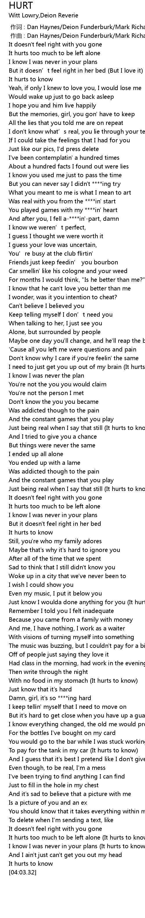 | [03:38.11] | It hurts too much to be left alone (It hurts to know) |