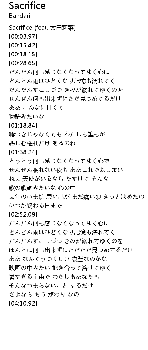 | [00:00.07] | Sacrifice (feat. 太田莉菜) |