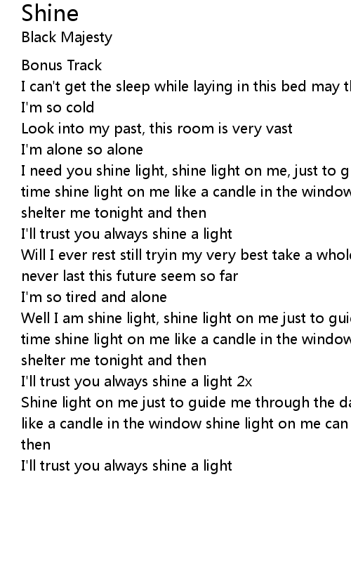 I need you shine light, shine light on me, just to guide me through the darkest time shine light on me like a candle in the window shine light on me can you shelter me tonight and then |