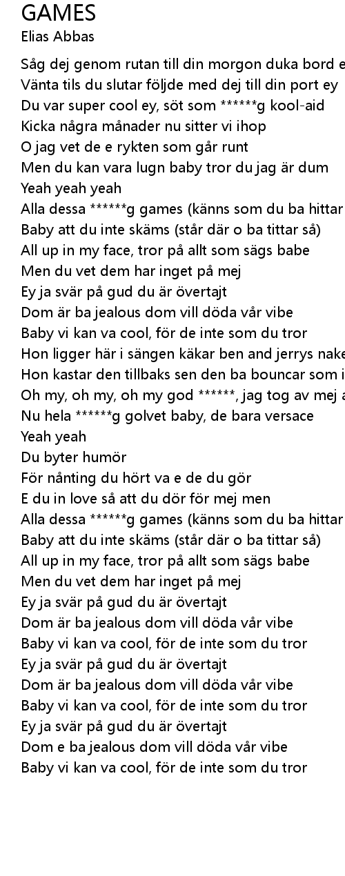 | [01:16.67] | Alla dessa ******g games (känns som du ba hittar på) |