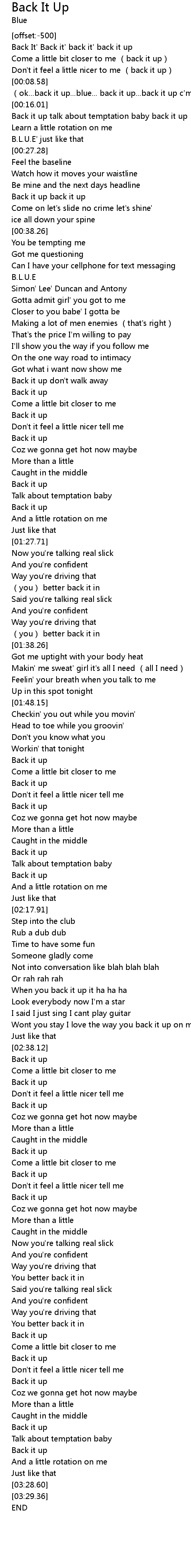 | [00:17.88] | Back it up talk about temptation baby back it up |