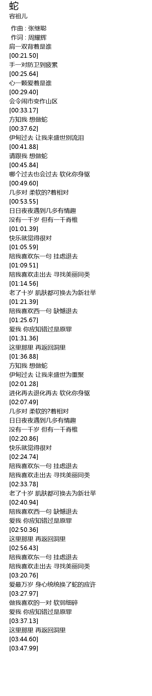 | [03:21.26] | 爱最万岁 身心统统换了蛇的应许 |