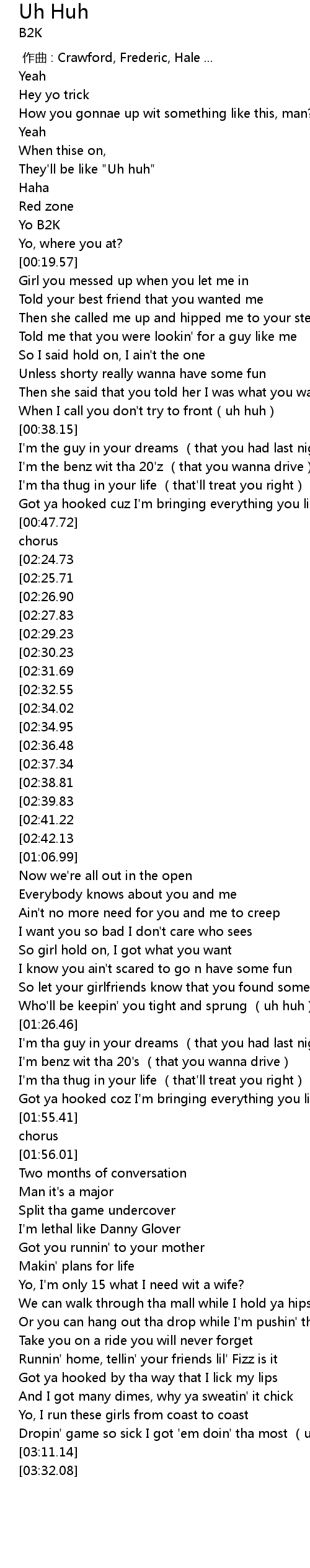 | [02:58.04][02:38.81][01:50.71][01:02.44] | Uh huh |