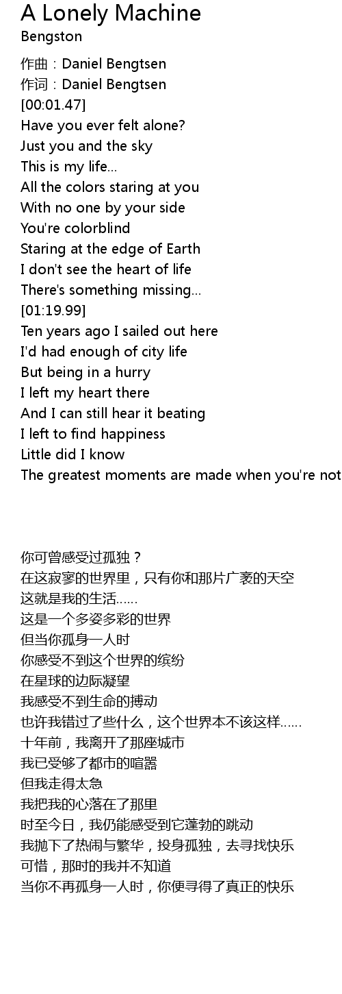 | [00:45.39] | 在这寂寥的世界里,只有你和那片广袤的天空 |