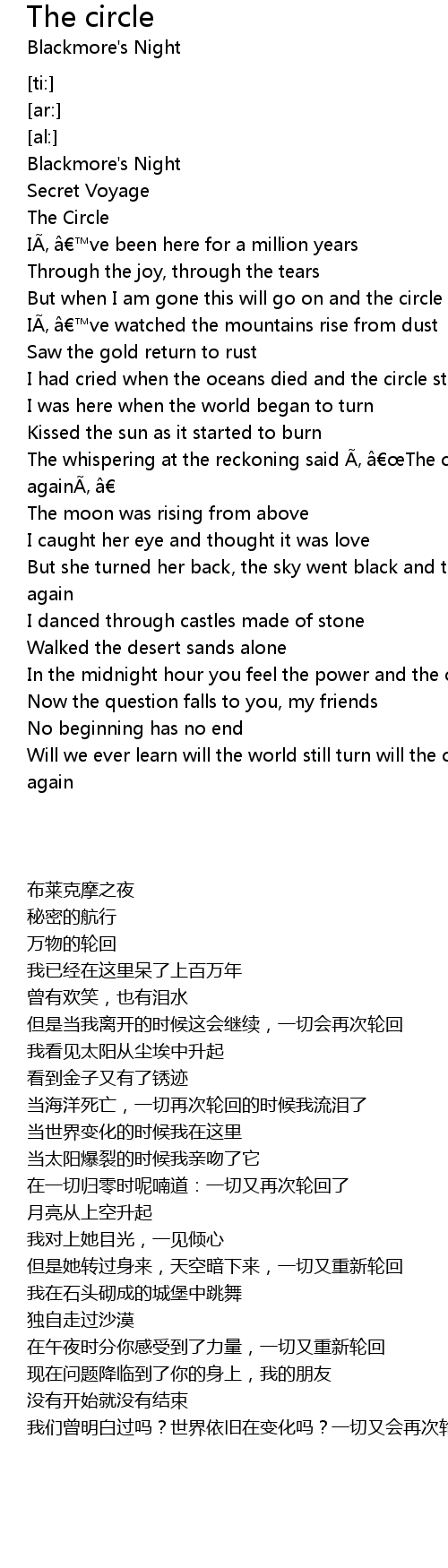 | [01:43.11] | The whispering at the reckoning said “The circle starts again†|