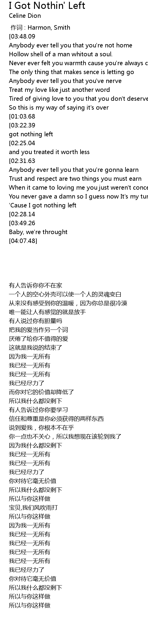 | [03:29.47][03:22.39][03:16.20][03:08.89][02:18.06][02:11.73][01:17.28][01:10.39] | I've got nothing left |