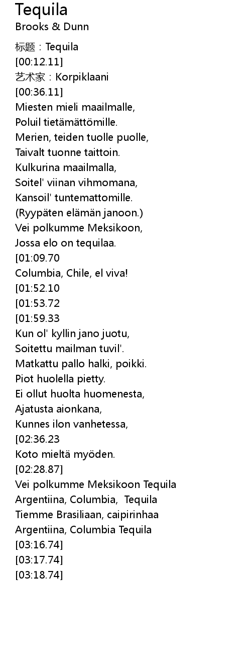| [02:59.88] | Vei polkumme Meksikoon Tequila |