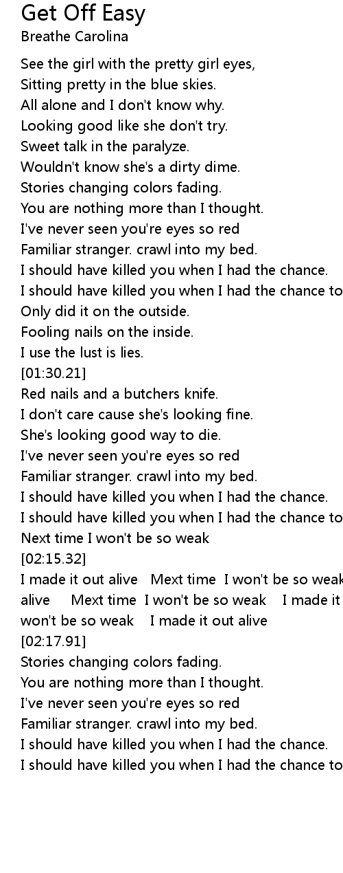 [03:03.73] I should have killed you when I had the chance to get off easy.