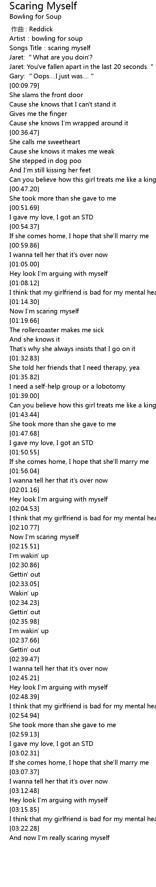 | [03:17.28] | I think that my girlfriend is bad for my mental health |